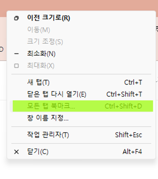 마우스 우클릭 후 [모든 탭 북마크]를 하거나